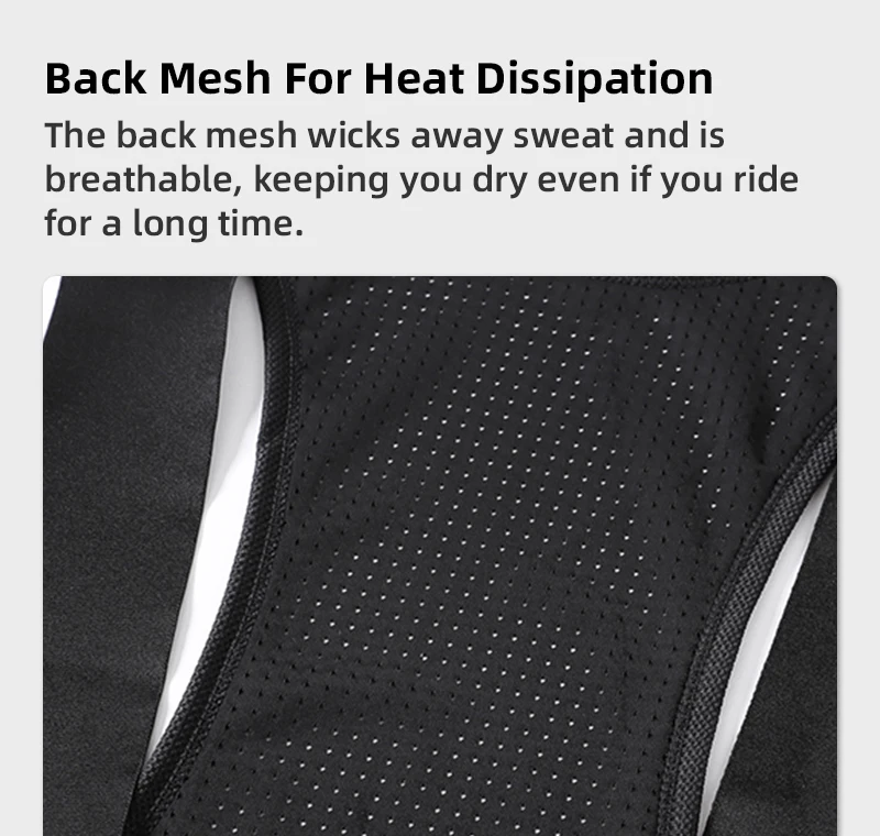 •Stripe mesh breathable fabric on the back designed to maintain breathability and dryness during long-distance cycling.